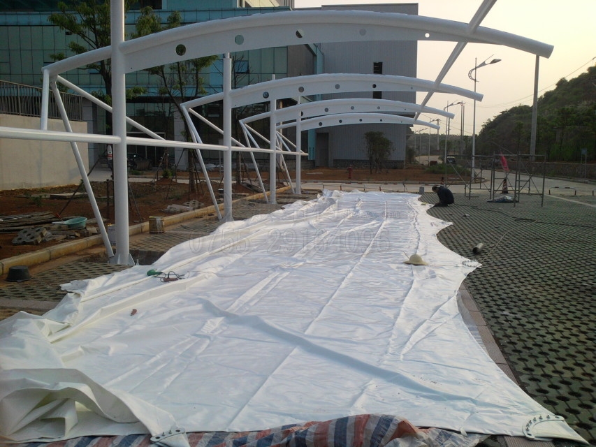 注意事項三:風(fēng)雨天氣不能裝膜。晴天時,5級以上風(fēng)速膜結(jié)構(gòu)施工應(yīng)該停工,因為膜布比較輕,受風(fēng)力影響較大;被雨水淋濕后,膜材表面、鋼結(jié)構(gòu)表面都會打滑,人站在上面容易發(fā)生踏空情況,安全隱患大。另外,當(dāng)膜布表面積水時,張拉受力會不均勻,此時極容易過度張拉,嚴(yán)重時會造成膜材被局部拉裂。