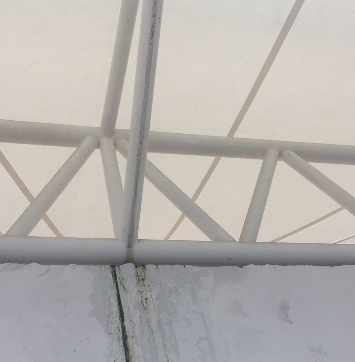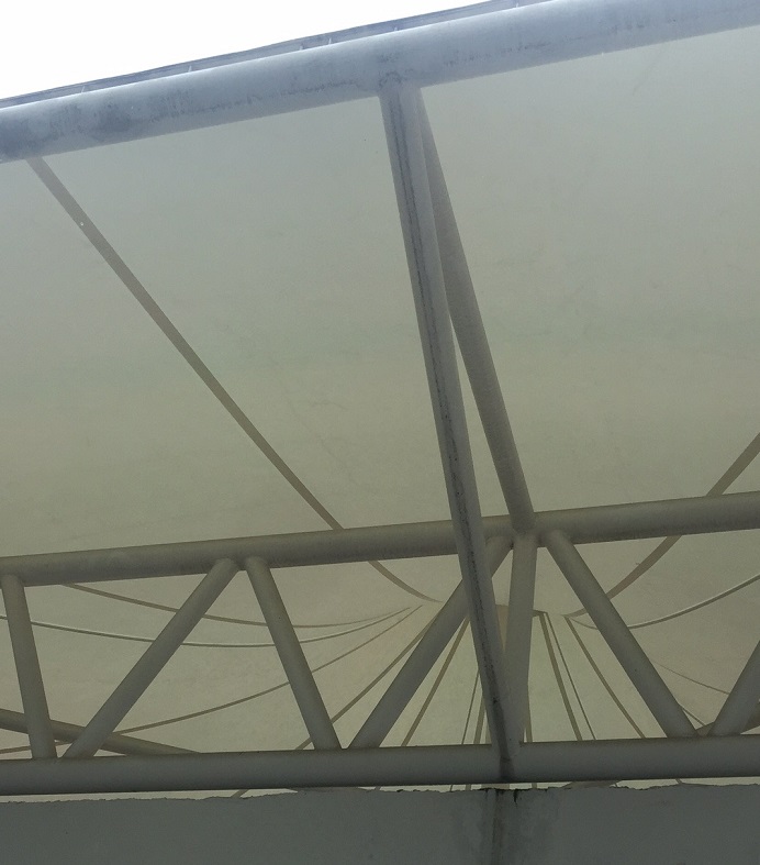 這里說的漏水,不是膜材穿孔造成的滲漏,是雨水在膜布上匯流到邊緣,然后順著鋼結構流入膜結構內部空間,使膜結構的防雨效果大打折扣,長期以往,會影響膜結構的整體使用壽命。