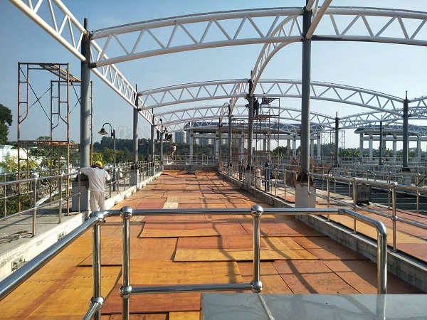 現(xiàn)場(chǎng)負(fù)責(zé)人告訴我,燁興龍華水廠膜結(jié)構(gòu)項(xiàng)目鋼構(gòu)加工目前已經(jīng)到達(dá)收尾階段,目前工人正在對(duì)鋼結(jié)構(gòu)進(jìn)行補(bǔ)漆工作。我們上到水池高臺(tái)后,也注意到在最靠里的邊角,一群工人正在抓緊施工。水池上全鋪了防污染蓋板,現(xiàn)場(chǎng)負(fù)責(zé)人指著正在施工的那片區(qū)域說(shuō),那是鋼結(jié)構(gòu)最后的施工地點(diǎn),也將是第一片膜材安裝地點(diǎn)。小編內(nèi)心猜測(cè),你說(shuō)得這么確定,是因?yàn)槟抢镤仢M(mǎn)防污染蓋板,正好不拆留著今后方便使用吧。