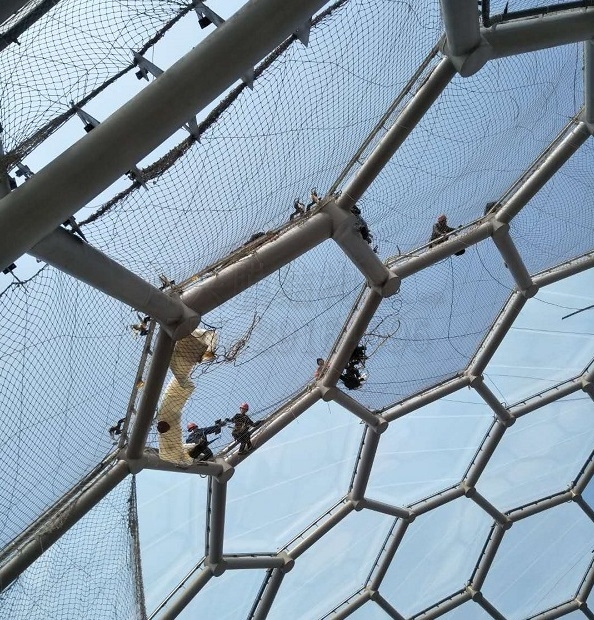 戶外高空作業(yè)環(huán)境下的低溫、雨雪天氣一直是ETFE氣枕膜裝膜過程中面臨的主要難題。雨雪天氣時,基本所有工作都要停工;面對高空作業(yè),只要嚴格執(zhí)行高空作業(yè)規(guī)程,提供安全可靠的防護措施(如穿戴安全繩和加裝安全網(wǎng)),就能保證順利作業(yè);當氣溫低于5℃時,對ETFE膜結(jié)構(gòu)工程來說,是不適合繼續(xù)作業(yè)的,春節(jié)期間,連云港當?shù)貧鉁刈畹驮诹愣纫韵?,為此,我們的工人只能利用白天正午時分氣溫大幅上升那段時間作業(yè),效率較低。