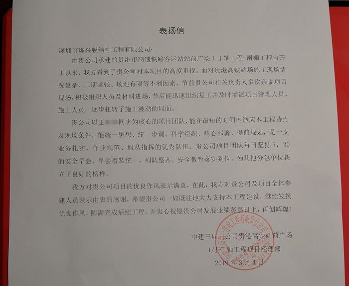 專注膜結(jié)構(gòu)行業(yè)15年,在不斷優(yōu)化成長(zhǎng)的過程中,我們逐漸收獲業(yè)主和發(fā)包單位一些口頭的表?yè)P(yáng)和感謝!因?yàn)楦杏X自身還有很多不足需要改善,我們把這些表?yè)P(yáng)和感謝當(dāng)做交際應(yīng)酬中的善意釋放,直到近日,一封蓋著中建三局發(fā)包單位紅章的表?yè)P(yáng)信送到我們的手中。這是我們第一次收到中字頭發(fā)包單位自發(fā)行為的書面感謝信!這張樸實(shí)無(wú)華的A4紙看起來(lái)很單薄,但傳遞給我們的信息卻很有力量,這是對(duì)我們深圳市燁興膜結(jié)構(gòu)工程有限公司實(shí)力的認(rèn)可和優(yōu)秀工作的表?yè)P(yáng),我們努力了這么多年,終于迎來(lái)美好的收獲。今天是植樹節(jié),種下努力的種子,收獲成功的綠洲!我想和您分享一下我們的喜悅。