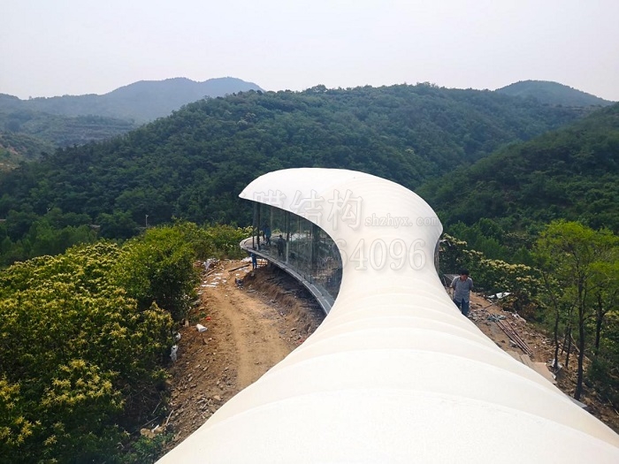 工程介紹:泰安書吧膜結構工程是一個集觀景、閱讀、休閑娛樂于一體的綜合項目,既有膜結構建筑本身的現(xiàn)代化氣息,又有設計者及建造者高超技藝賦予的精致典雅,給人一種時尚別致卻又內斂質樸的觀感。本工程建筑屋面為流線形,建筑面積約600平米。外膜采用德國進口白色環(huán)保膜材,內膜采用PTFE內膜,中間加保溫隔熱層,內膜需要安裝燈光。屋面以下為全封閉空間,墻體采用落地玻璃形式,從各個角度都能獲得極佳的視野效果