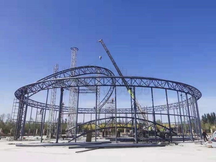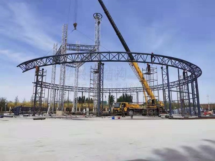 燁興-新疆喀什馬戲團(tuán)膜結(jié)構(gòu)表演館動(dòng)工多天,現(xiàn)場(chǎng)已經(jīng)拼裝制作出鋼結(jié)構(gòu)骨架的雛形,一起來了解一下吧。