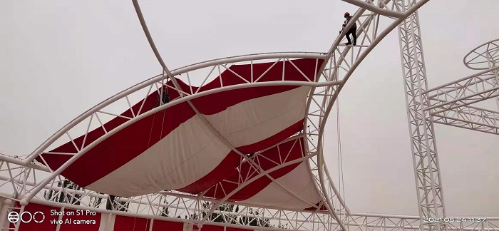 燁興-新疆喀什馬戲團(tuán)膜結(jié)構(gòu)表演館近期已進(jìn)入全面裝膜階段。今天小編將帶來(lái)現(xiàn)場(chǎng)的最新情況。