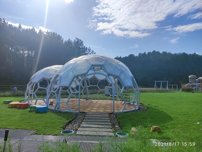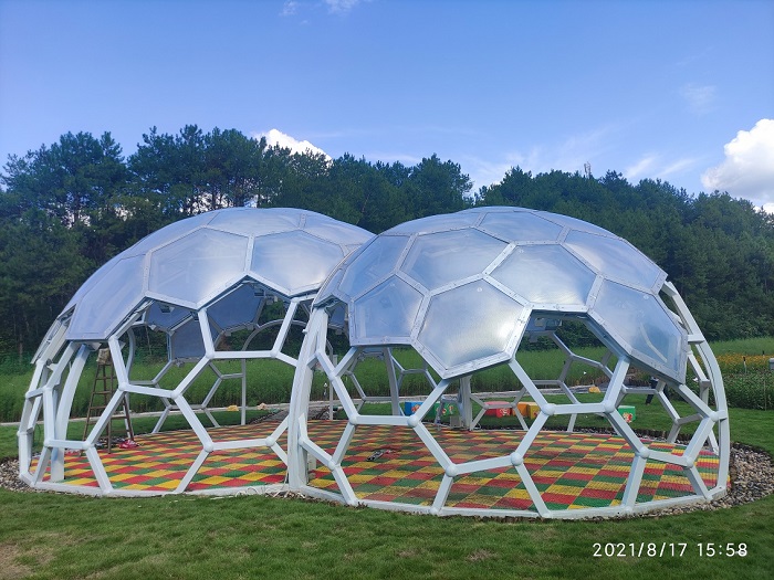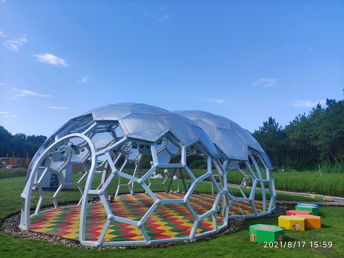 工程特點:該項目是黃山景區(qū)花山謎窟花山花海主題園內(nèi)的一個ETFE膜結(jié)構(gòu)藝術(shù)景觀工程,目的是打造一個高顏值的游客拍照打卡地點。黃山花山謎窟藝術(shù)景觀整體是兩個緊鄰的半球形鋼結(jié)構(gòu)大氣泡,用泰森多邊形將兩個鋼結(jié)構(gòu)殼體分成若干具有藝術(shù)視覺的單元,然后再用ETFE氣枕膜將殼體的上半部分覆蓋,形成一個給人強(qiáng)烈氣泡感的半敞開鋼結(jié)構(gòu)涼亭景觀。