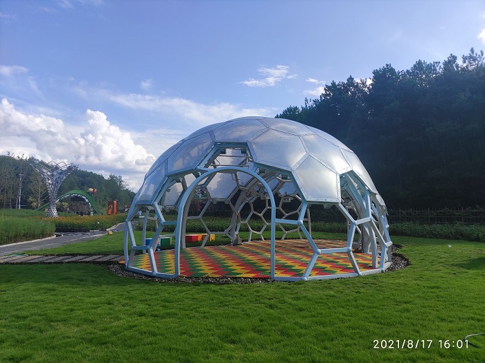 這個小巧ETFE膜結(jié)構(gòu)景觀,從鋼結(jié)構(gòu)骨架到鋁合金支架固定的ETFE氣枕,所有材料的加工和制作都精巧細(xì)致,游客無論從遠(yuǎn)觀還是近看,它都是吸引人駐足打卡的美麗藝術(shù)品。我們還為這個ETFE膜結(jié)構(gòu)景觀配備了鐳射彩燈渲染系統(tǒng)、音樂系統(tǒng)、自動發(fā)泡系統(tǒng),配合周邊的鮮花草坪,能給游人營造出一種夢幻唯美的浪漫體驗。